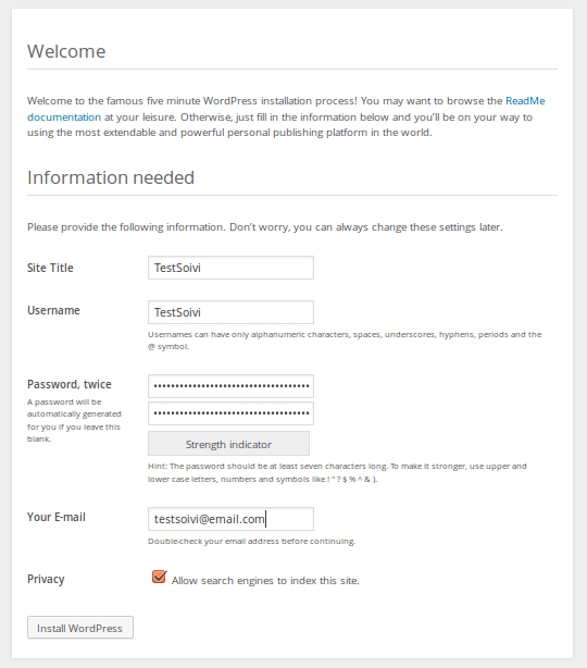 Add your WordPress information. DON’T FORGET TO ALLOW SEARCH ENGINES TO INDEX YOUR SITE. This means you get more hits from search engines and people will find your blog.